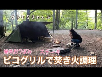 【女子ソロキャンプ】ピコグリルで焚き火調理!キャンプ飯の憧れスキレットでステーキとチーズとサンマの缶詰でお酒に合う簡単おつまみ作ったよ【バンドックソロベース】